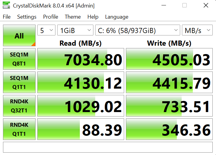 As for the SSD, we're not 100% sure who the OEM for this drive is, as almost nothing can be found online when searching the model number. Still, it is a PCIe 4.0 drive, with very fast reads at 7GB/s. The writes are a bit slower though, at 4.5GB/s, but for a gaming laptop of this class, I'd say drive performance is more than acceptable.