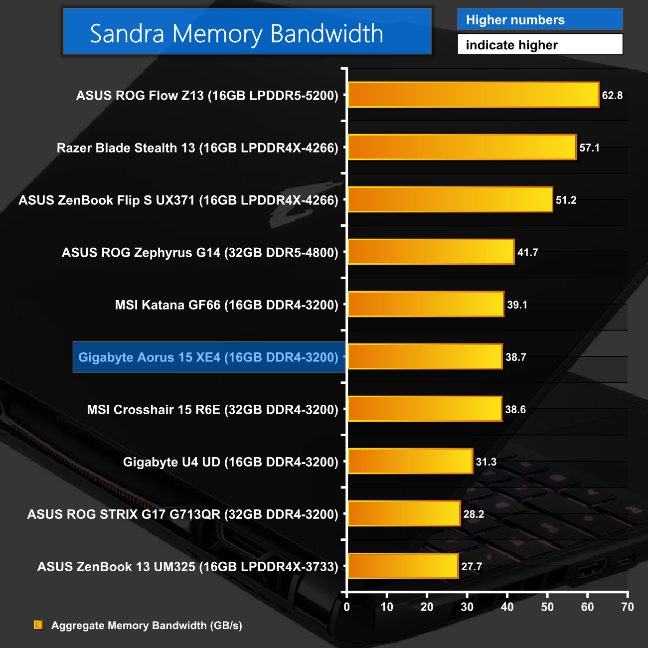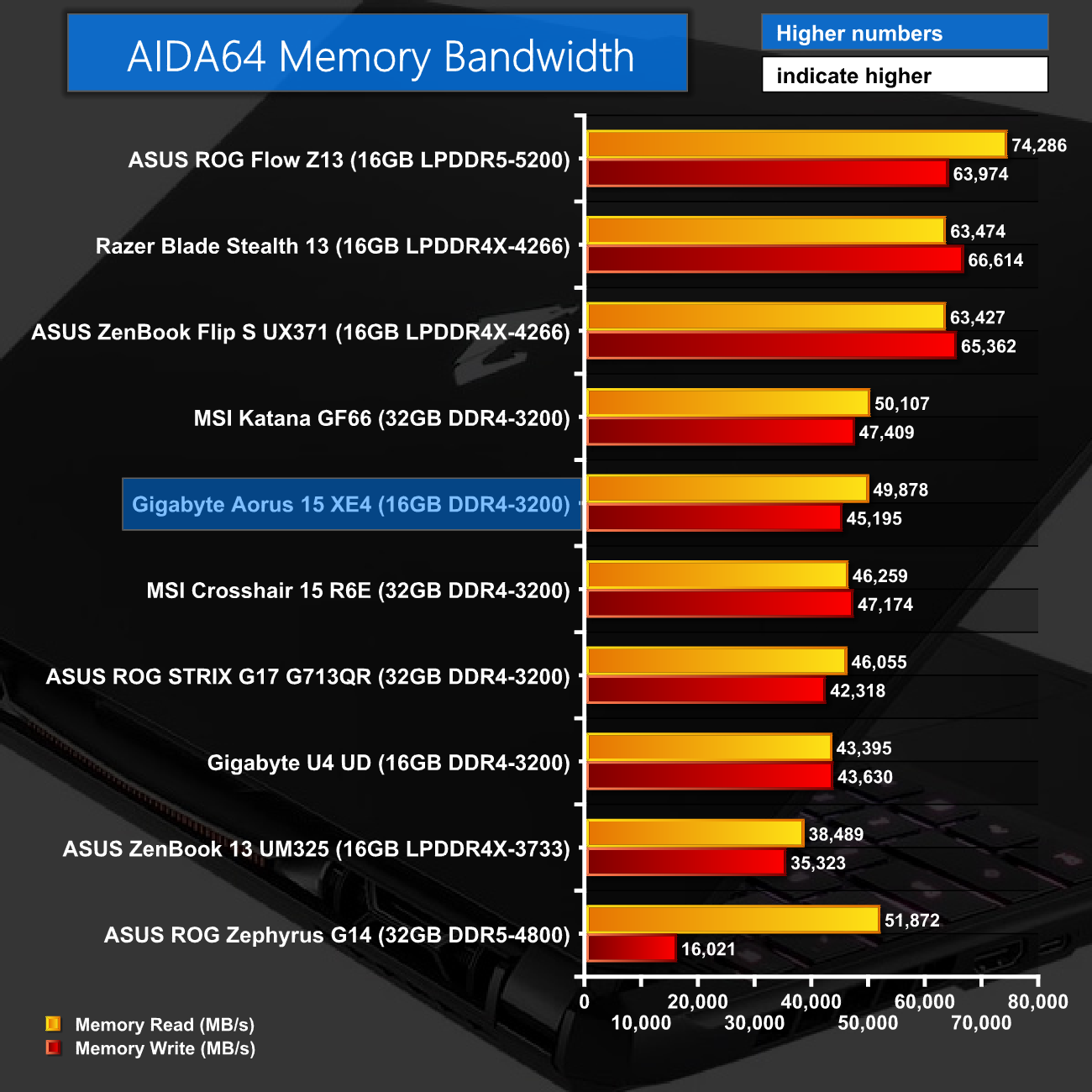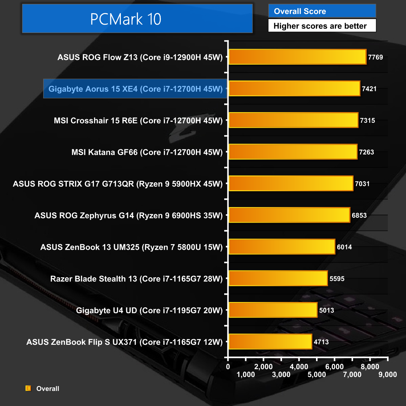 As for PCMark 10, the Aorus 15 is again competitive. The ROG Flow Z13, with its 12900H, does score a few hundred point more, but as an indicator of overall system performance, we can't complain with this result.