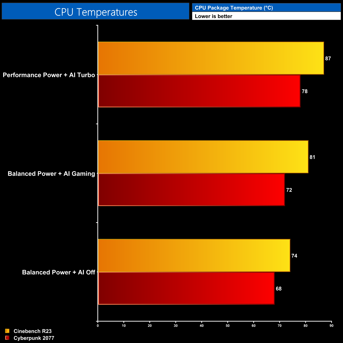 For our thermal tests, we ran Cinebench R23 and Cyberpunk 2077 for 30 minutes each and recorded steady-state temperatures at the end of the tests.