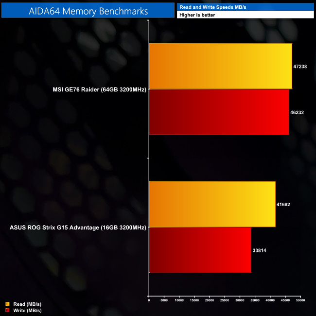 Memory bandwidth is solid with the GE76 Raider, delivering reads and writes around the 46000-47000MB/s mark. This is clearly superior to the results posted by the ROG Strix G15 Advantage as a result of that laptop using memory modules with poor secondary timings.