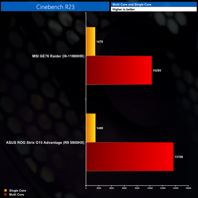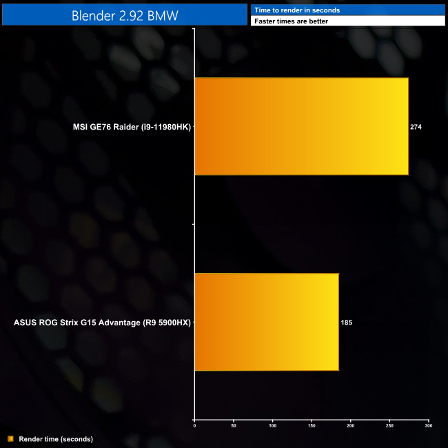 There's no doubt that Intel's i9-11980HK CPU is capable, but AMD's Ryzen 9 5900HX is the faster chip for CPU-only workloads. It renders the Blender BMW scene in just over two-thirds of the time it takes the i9, while Handbrake encoding is also 10% faster. Cinebench's multicore score shows a healthy lead for Ryzen, but the singlecore metric is much closer, with almost nothing to split between the two CPUs there.
