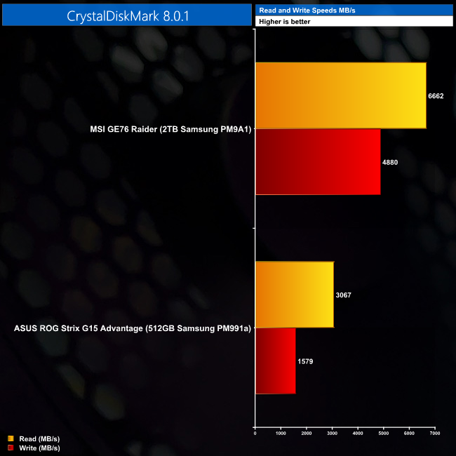 MSI has opted for the PCIe 4.0 PM9A1 SSD with the GE76 Raider, delivering highly impressive speeds. It may not be as fast as the likes of the 980 Pro or WD SN850, but for a laptop drive it is very quick indeed.