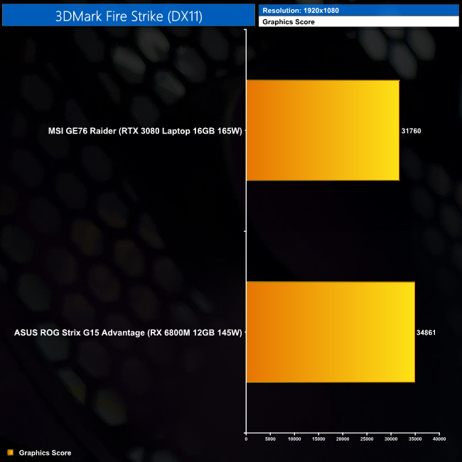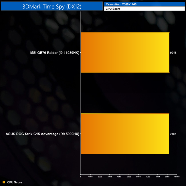The 3DMark results are a bit of a mixed bag. Fire Strike clearly prefers AMD graphics so that result isn't a surprise, but then the RTX 3080 Laptop GPU is faster by over 1000 points in Time Spy. For the Time SPY CPU however, we are again looking at very small margins between the 5900HX and i9-11980HK.