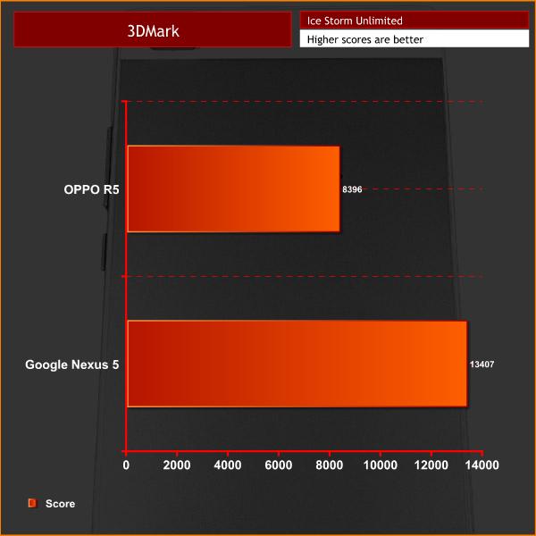 A score of 8396 in 3DMark's Ice Storm Unlimited is not as good, though, with the Nexus 5 pulling ahead with 13407.