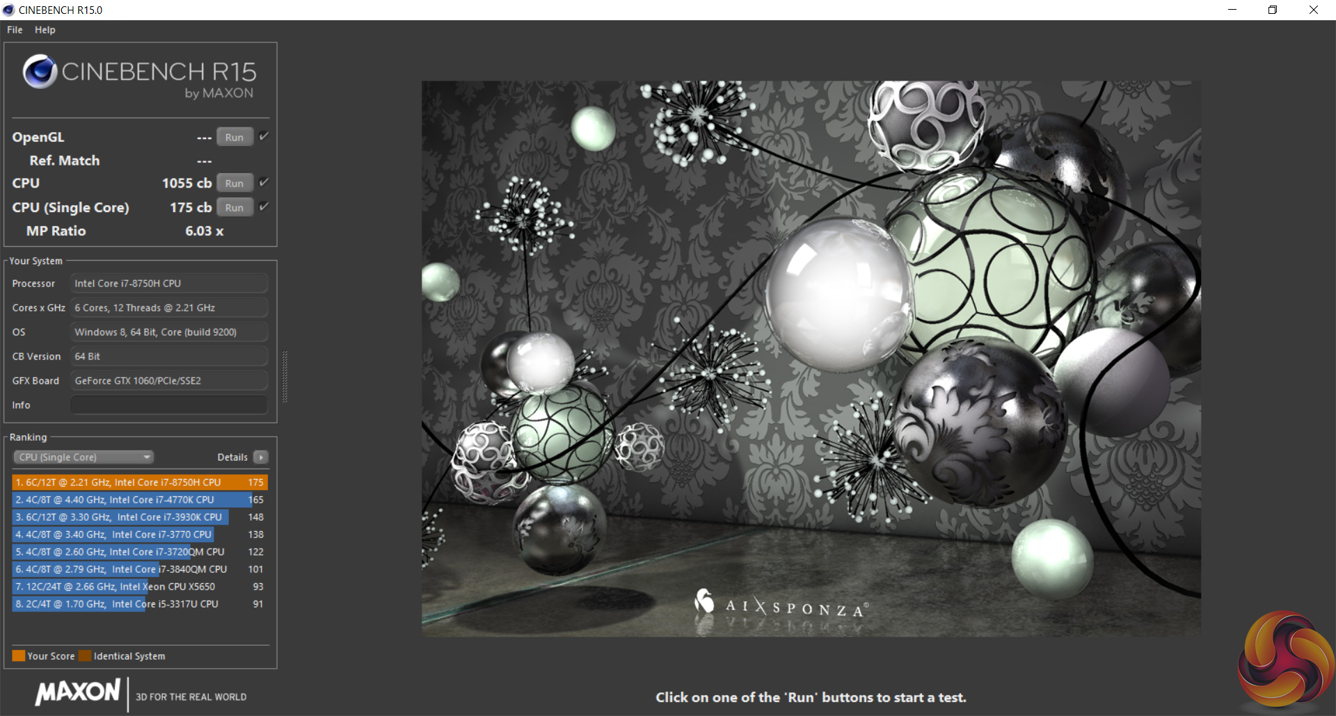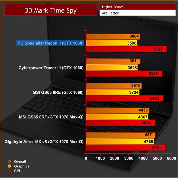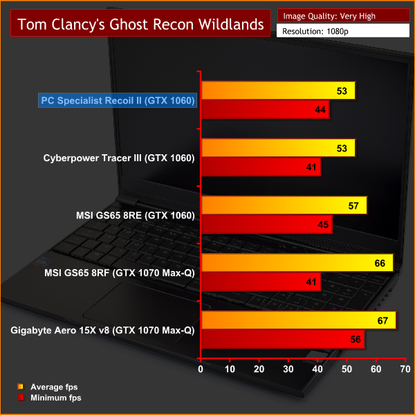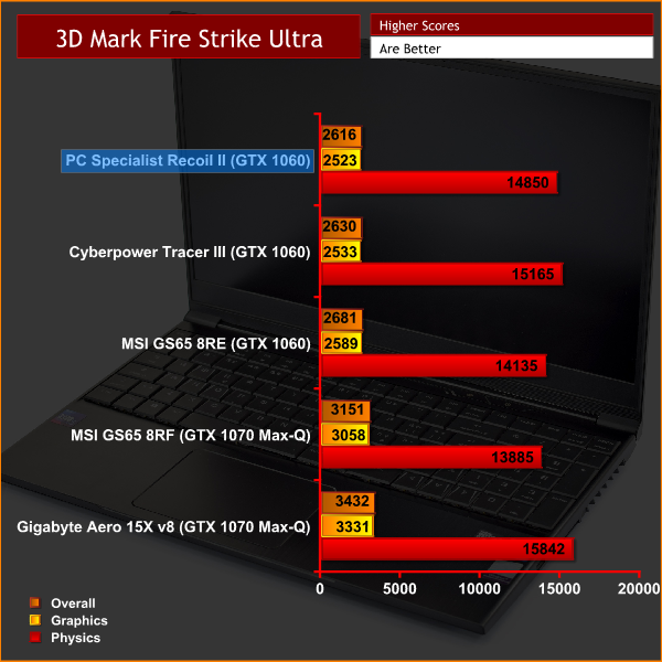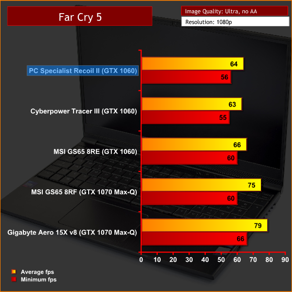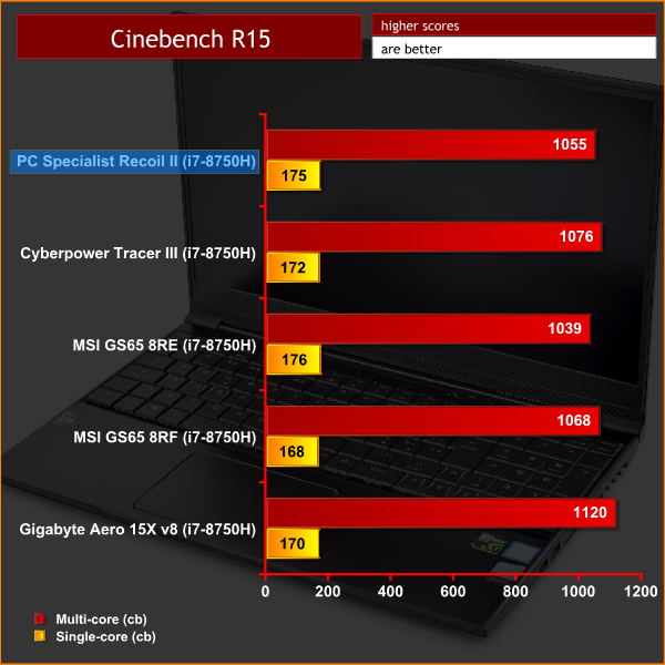 When testing the Recoil II, we compared it directly to both configurations of the MSI GS65 we have tested, as well the Gigabyte Aero 15X and Cyberpower Tracer III. All four laptops use the i7-8750H processor, while the graphics varies between full-fat GTX 1060s, and GTX 1070 Max-Q models.