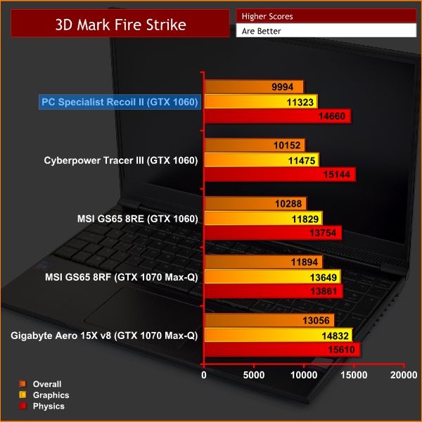 Starting off with the CPU performance of the Recoil II, the Cinebench score puts it pretty much in the middle of the 5 laptops on-test today. Its 3DMark physics scores are also pretty much what we would expect from the hexa-core i7-8750H, so no surprises there.