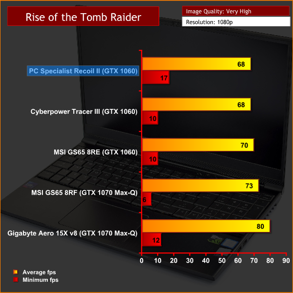 In terms of actual gaming, the results are very similar to the Cyberpower Tracer III – in most tests, the Recoil II is only 1fps faster on average, if at all, though its minimum frame rates are a little bit better than the Tracer III. We can explain this with the fact that the GPU was boosting to a slightly higher frequency – with the Recoil II, our in-game core frequency settled at around the 1570-1580MHz mark, whereas the Tracer III was a little slower at 1550-1570MHz.