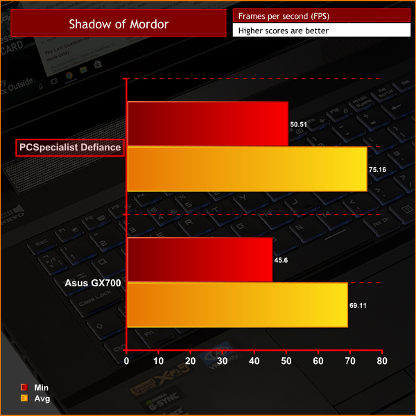 Again, we see slightly higher frame rates for the Defiance III over the GX700. In this demanding game, a minimum of 50fps is a great score, too.