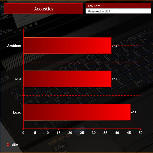 To measure the acoustics performance of the Defiance III I used a digital sound meter. I first took an ambient reading to act as a baseline figure, before measuring the laptop's noise levels at idle and under load.
