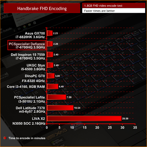 Another similar story with my Handbrake video encoding test. The extra clock speed of the i7-6820HK pushes it into a slender lead of just 5 seconds, though both scores are excellent.