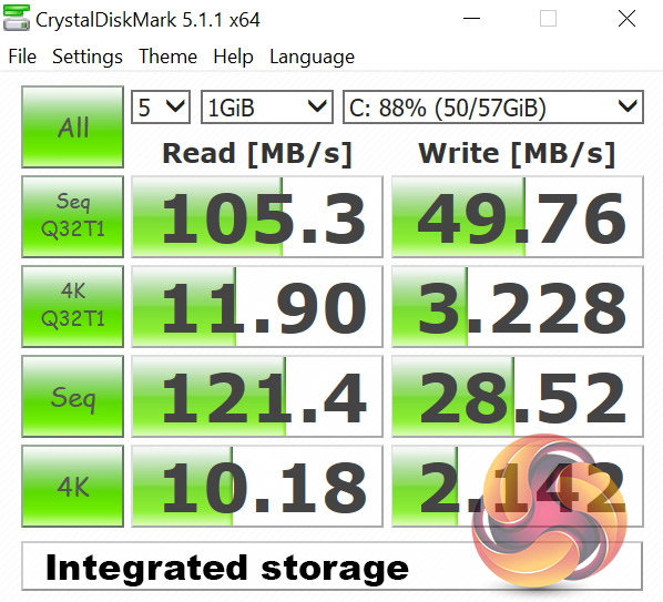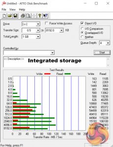 CrystalDiskMark and ATTO Disk Benchmark are used to benchmark the system's integrated storage.
