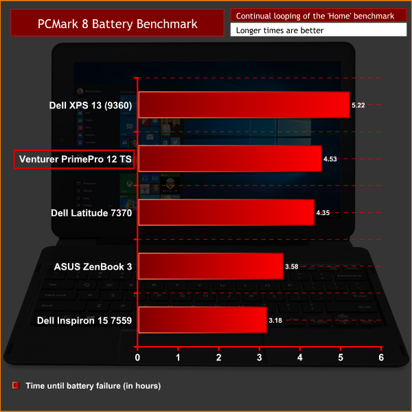 The last area to test is the battery life of the PrimePro 12 TS. To do this, we use PCMark 8's in-built battery benchmark, running the ‘Home conventional' test with screen brightness at 50%.