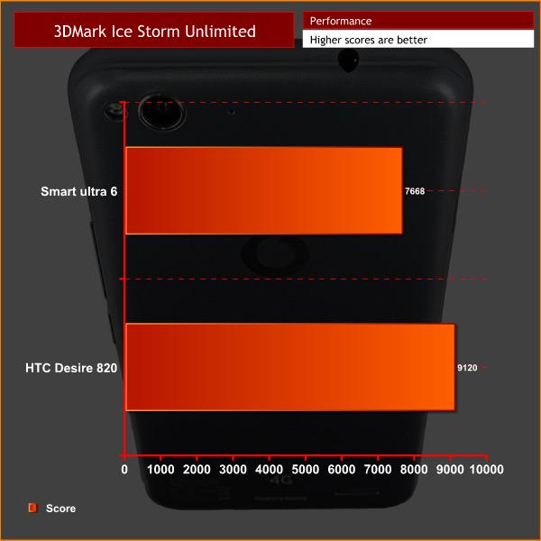 In 3DMark Ice Storm Unlimited, the scores were also close. The Smart ultra 6 scored 7668 to the HTC's 9120. This is a slightly bigger difference than expected, but it is not enough to be concerning.