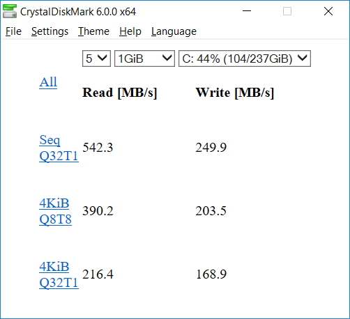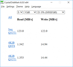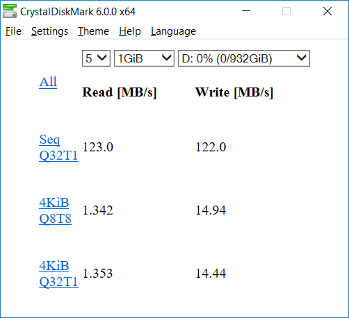 CrystalDiskMark 5.1.1 is an industry standard benchmark for testing the raw speed of a storage device. It uses a test file to variously write data to or read data from the drive, checking for sequential read and write speed and random read and write performance, with it also testing performance at various queue depths. The size of the test file can be selected from 50MB to 32GB. We test using the default 1GB file size.