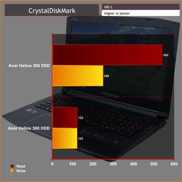 The Toshiba SSD used here is frankly a bit disappointing. Despite using a modern M.2 form factor it doesn’t use the modern NVMe connection standard so is limited to around 550MB/s read and write speed. However, it even struggles to hit these theoretical figures with it managing 542MB/s read speed and just 250MB/s write speed. By modern standards that’s downright poor.