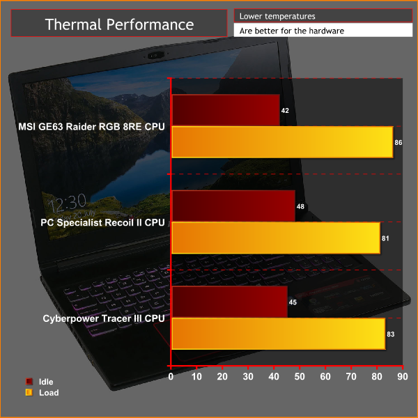 When it comes to keeping cool under pressure, the GE63 does a decent job. Its CPU temperature of 86°C under load is a touch higher than some others but is in the same ballpark. Meanwhile, it’s idle temperature of 42°C is comfortably below its main rivals.