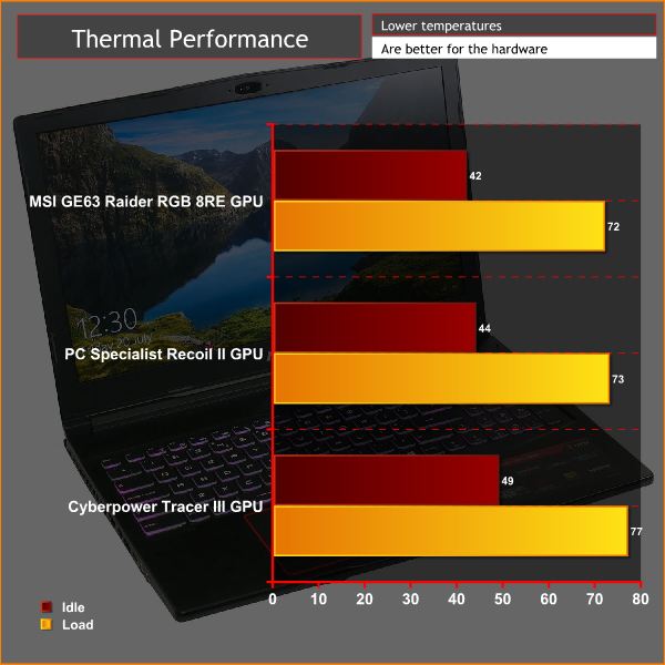 As for GPU temperatures, these are even more impressive with this being the coolest of the three laptops we’re directly comparing here.