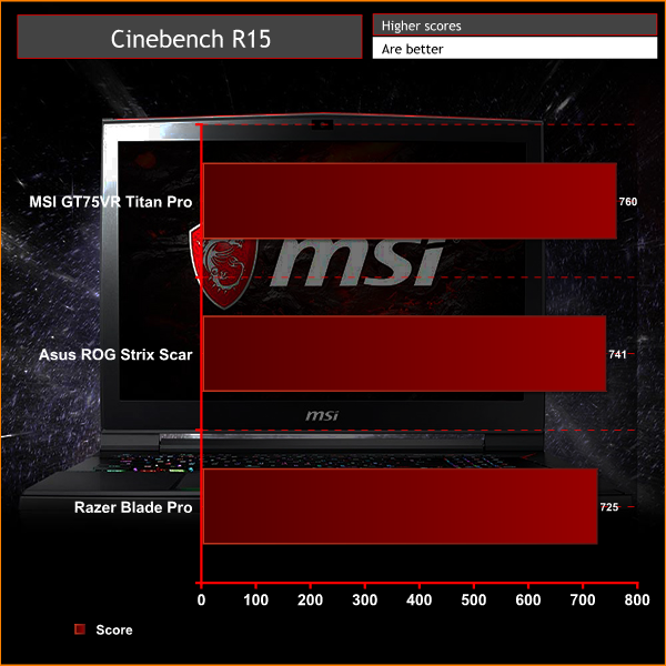 With essentially the fastest laptop CPU you can buy onboard, it’s no surprise the GT75VR puts in an impressive performance in our Cinebench test. Its multi-core score of 747 is among the fastest we’ve seen for laptops using this processor and its single-core score of 163 is mighty nippy too.