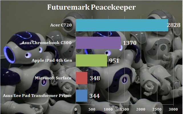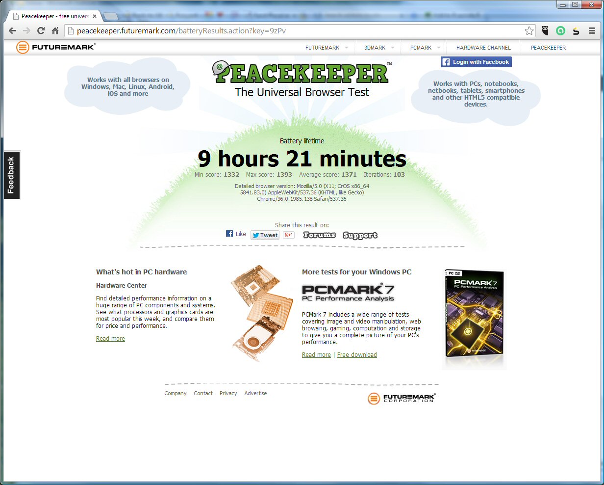 This being a Chromebook, we couldn't run our usual suite of benchmarks for Windows. Instead, we used Futuremark's Peacekeeper browser benchmark. It achieved a score of 1,370, which (according to Futuremark's own benchmark database) is four times quicker than an Asus Eee Pad Transformer Prime, which scored 344, or Microsoft's original Surface, which managed 348. Even an Apple iPad 4th Gen only achieved 951.