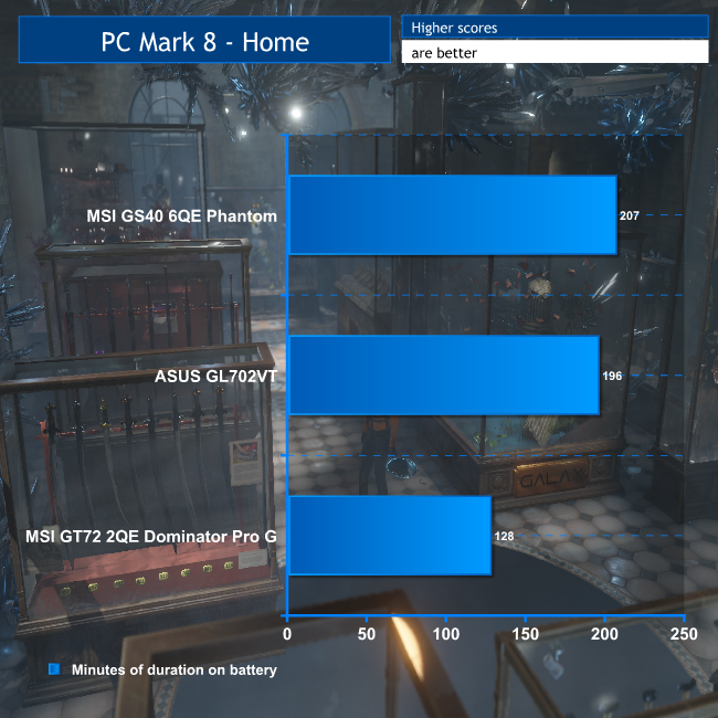 These test scripts don't stress the gaming performance particularly, so this time doesn't represent how long you could play on battery, although there is some 3D activity included. It's supposed to represent a mixture of everyday home user tasks.