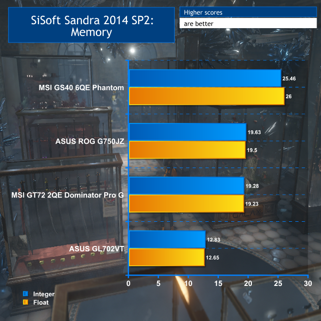 Thanks to having just one memory DIMM, the GL702VT is reduced to single-channel memory performance, and its bandwidth is clearly almost exactly half that of the MSI notebook, despite using the same 2,133MHz memory and having the same 16GB quantity.