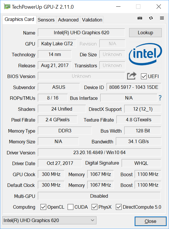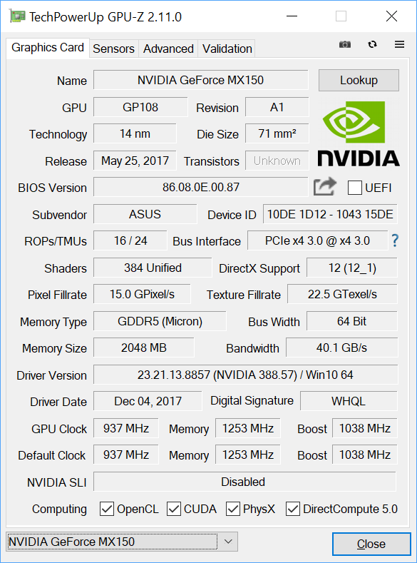 This brings us to the UX331UN's party trick – its discrete graphics. Although you get Intel UHD 620 graphics built into the CPU, which is reasonably competent, there's also a separate NVIDIA GeForce MX150 GPU on board. This is a Pascal-generation graphics chip using the GP108 silicon. It's essentially the mobile version of the GeForce GT 1030, and the successor to the 940MX.