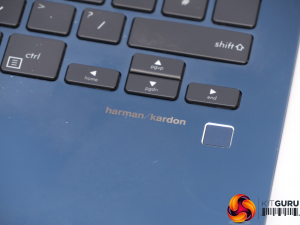 The fingerprint reader sits next to the branding for the speakers – Harmon Kardon. This is a good heritage, and the sound does have a bit more bass and body than with many ultraportable notebooks. If you don't have headphones handy, the UX331UN's audio is decent enough.