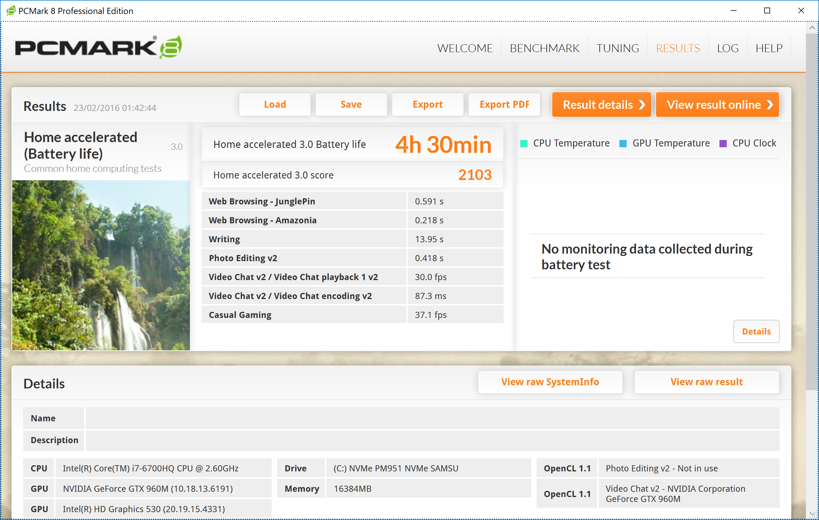 We tested the Dell XPS 16 with Battery Saver turned on and a 50 per cent screen brightness, using the PC Mark 8 Home battery test, which runs a series of productivity tasks until the power runs out. These test scripts don't stress the gaming performance particularly, so this time doesn't represent how long you could play games on battery, although there is some 3D activity included. It's supposed to represent a mixture of everyday home user tasks.