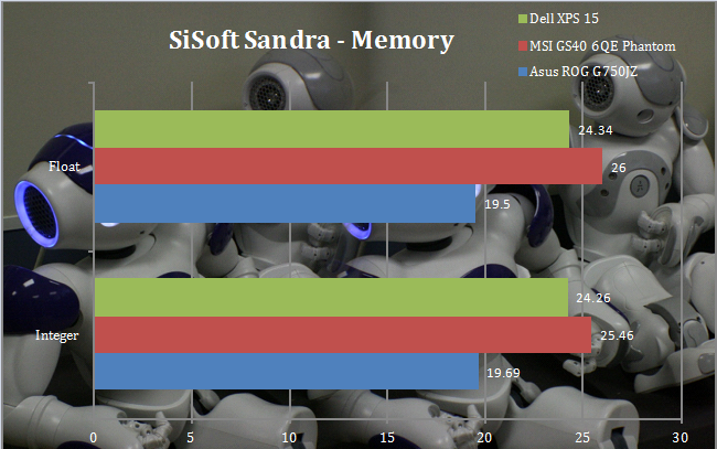 The XPS 15's 2,133MHz DDR4 memory clearly wins out against the DDR3 in the Asus ROG G750JZ, offering 25-30 per cent more bandwidth, but is behind the MSI GS40 6QE Phantom, which has similar memory.