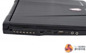 The larger notebook form factors usually allow room for plenty of ports, and the GE73 is reasonably well endowed in this area. The left side is the most well endowed, with headphone and microphone minijacks, USB 3.1 Gen 2 Type C and Type A, Mini DisplayPort, full-sized HDMI, and Gigabit Ethernet. The other side of the air vent is a Kensington lock slot.