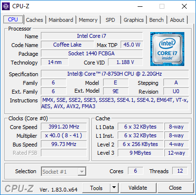 The Intel Core i7-8750H isn't the top member of the current Intel Coffee Lake mobile range. There is, in fact, now a Core i9 member, and the 8750H is the middle of the Core i7 options. But it's still a six-core CPU with Hyper-Threading. The nominal frequency is 2.2GHz, but in reality the processor will rarely run at this speed. A single core can hit 4.1GHz, which will be great for some games, four cores can run at 4GHz, and all six cores can run at 3.9GHz. So it's really a very potent mobile CPU indeed.