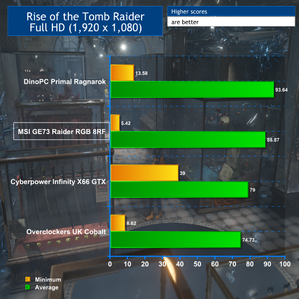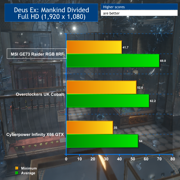 The GE73's abilities with Deus Ex: Mankind Divided are even more impressive than with Rise of the Tomb Raider, although we don't have any comparable results from the DinoPC, which would probably have achieved a similar frame rate. Nevertheless, we can safely say that the GE73 will cope with pretty much any current title at its native Full HD screen resolution and high quality settings, and could drive some games at respectable frame rates on an external monitor at 1,440p, although 4K might be a stretch for some titles.