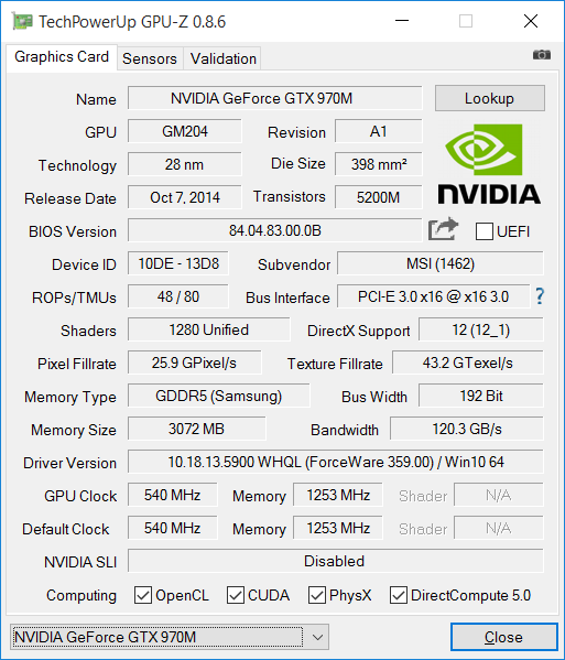 This is not the fastest mobile NVIDIA GeForce currently available, but it's close, with 1,280 CUDA cores running at a base 540MHz. This is backed by 3GB of 5,000MHz GDDR5 memory, although the memory path is just 192-bit – the top GTX980M uses 256-bit, providing significantly higher bandwidth. This is a recent GPU with DirectX 12 support, too.