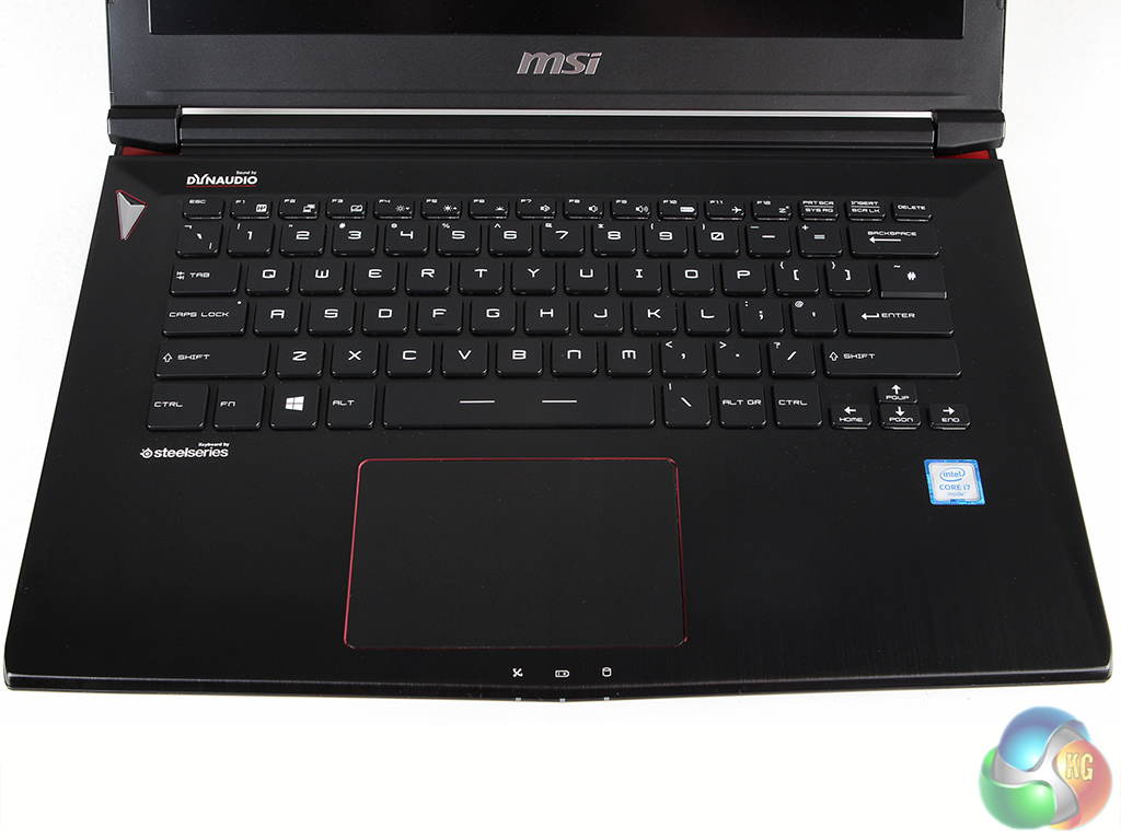 The MSI GS40 6QF Phantom comes in an attractive black chassis with a brushed metal appearance. Since this is a 14.1in notebook, there's only room for a full-sized keyboard, not a separate keypad.