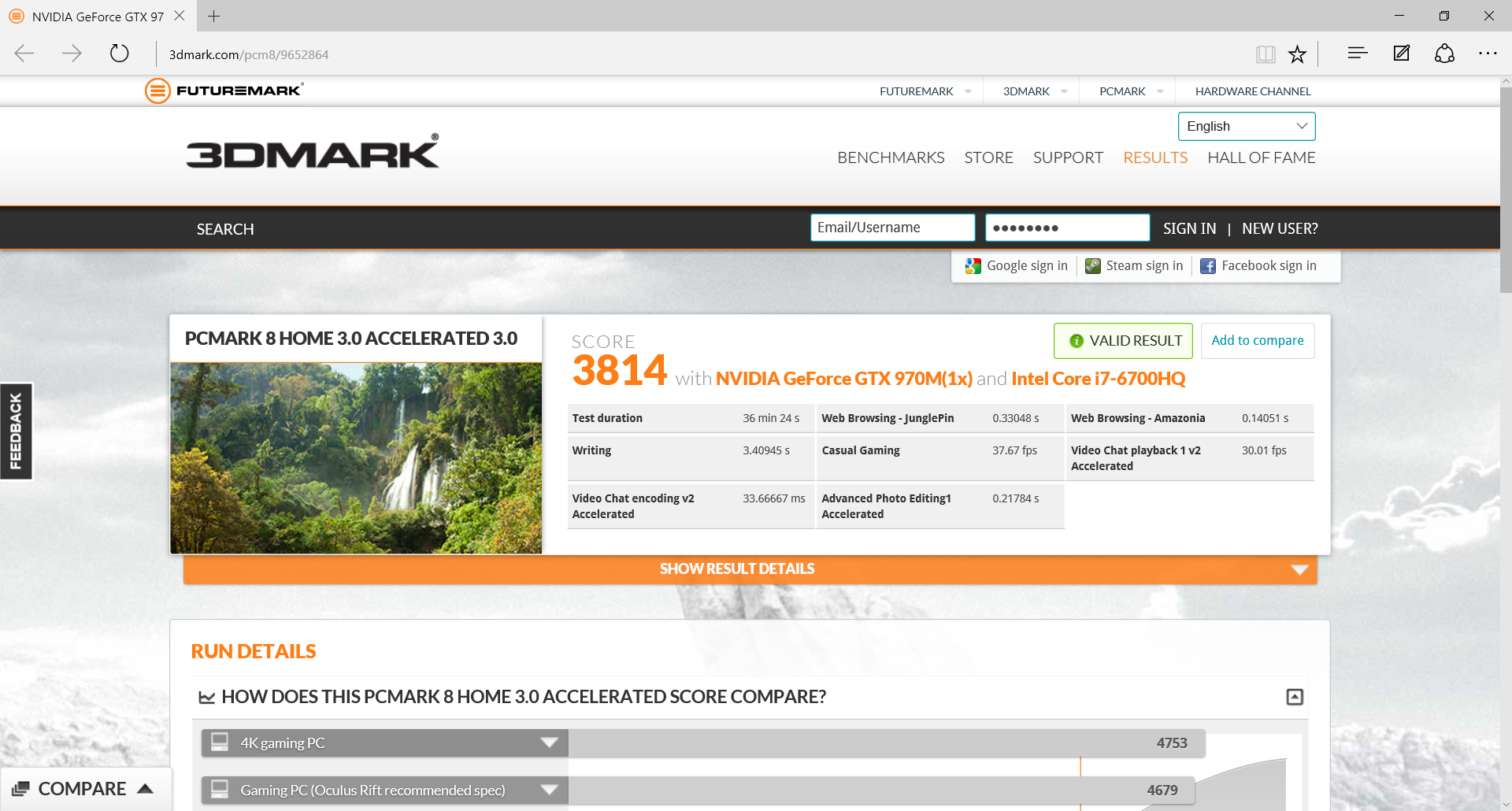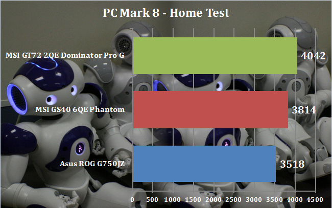 The PC Mark 8 Home test parallels the results from the Cinebench R15 CPU test, with the MSI GT72 2QE Dominator Pro G scoring top and the Asus ROG G750JZ bottom. So the MSI GS40's middle score will be great for everyday producivity.