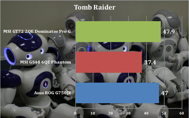 The MSI GS40's Tomb Raider score is behind the MSI GT72 2QE Dominator Pro G. The latter's GTX980M has a greater number of CUDA cores, running at a faster core clock, and 8GB of GDDR5 with a wider memory bus.