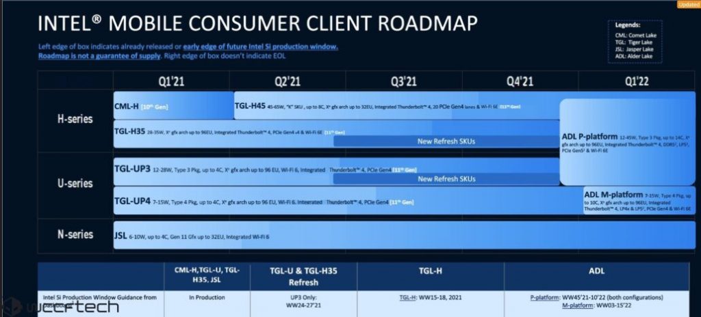 What seems to be a leaked roadmap referring to Intel mobile consumer CPUs has been posted online, corroborating some rumours. Moreover, the roadmap also shows when production of the Alder Lake mobile platforms will start, giving us an idea of when we will see the first devices equipped with them.