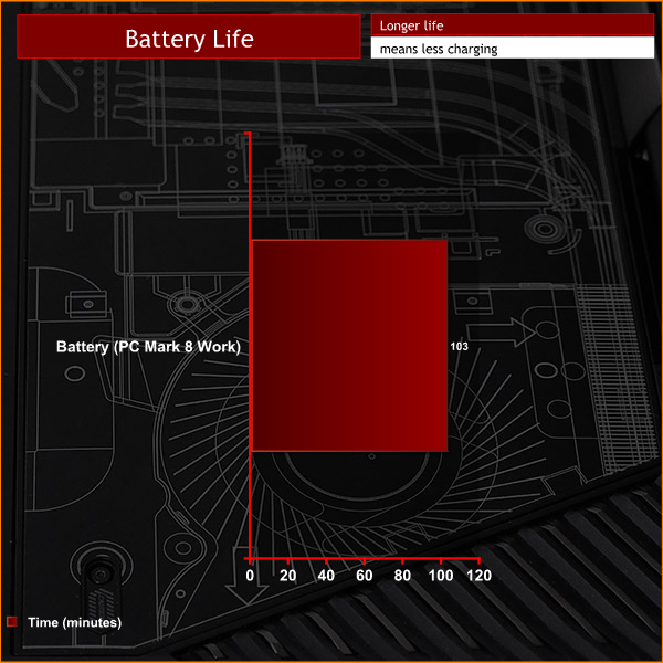 We were stunned to see the battery will keep the Acer Predator 21 X running in PC Mark 8 for one hour 43 minutes, which you can double to three and a half hours in the real world. The battery is a decent size at 88Wh/6600mAh but not massively large so this is testament to the power saving technology in Intel and Nvidia silicon.
