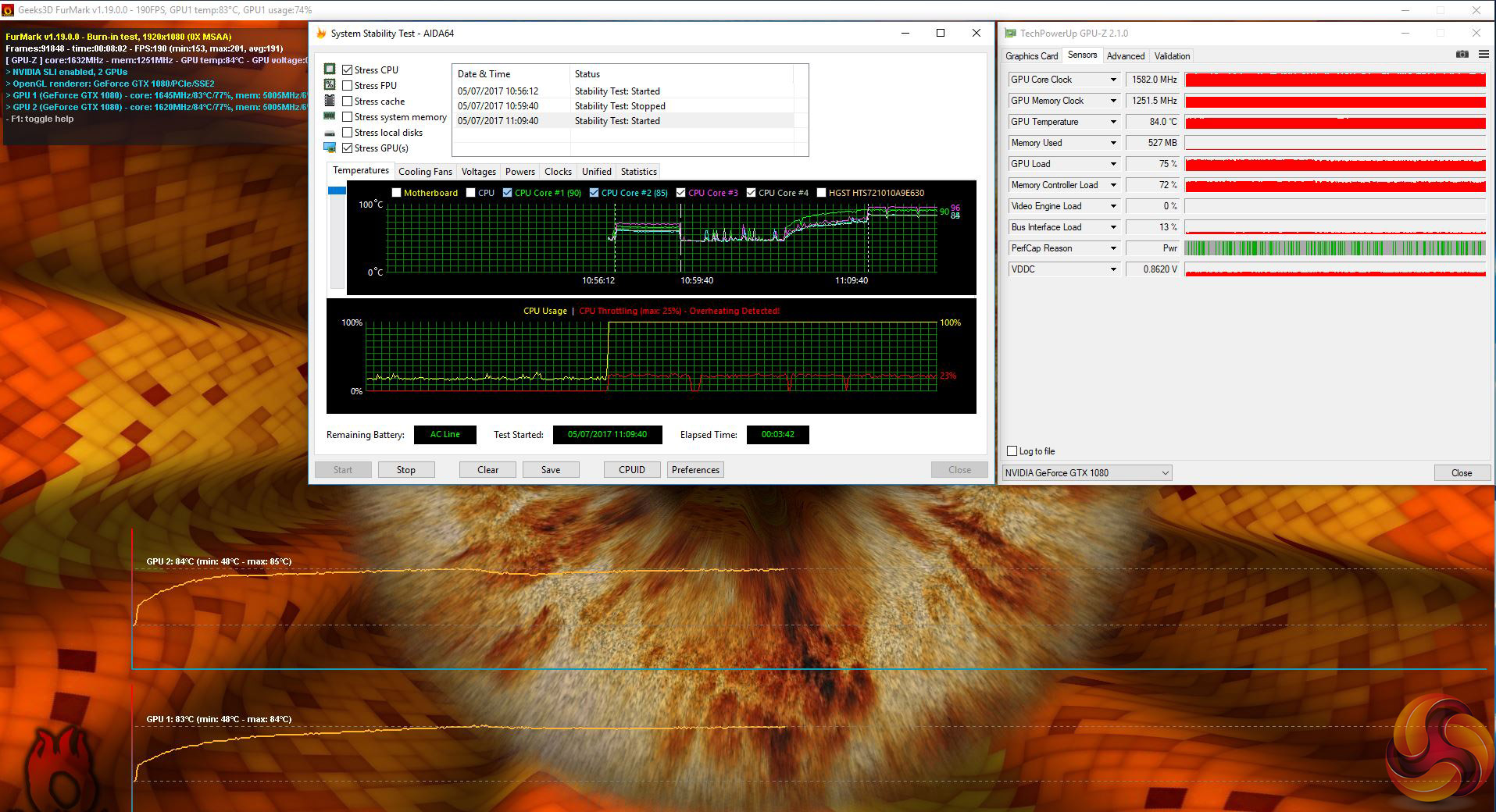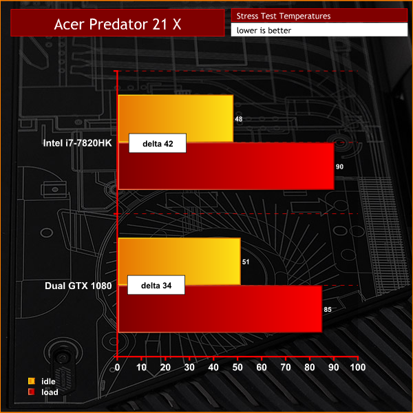 In our stress tests the CPU temperature sat at 90 degrees and the GPUs were in the mid-80s. Gaming temperatures were 5-7 degrees cooler than those stress test figures.