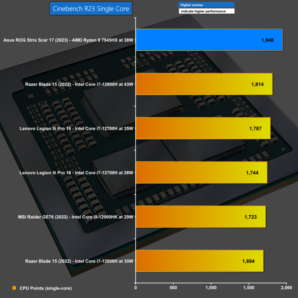 In Cinebench R23 Single Core, AMD scores another victory with the single core running at 5.4GHz.