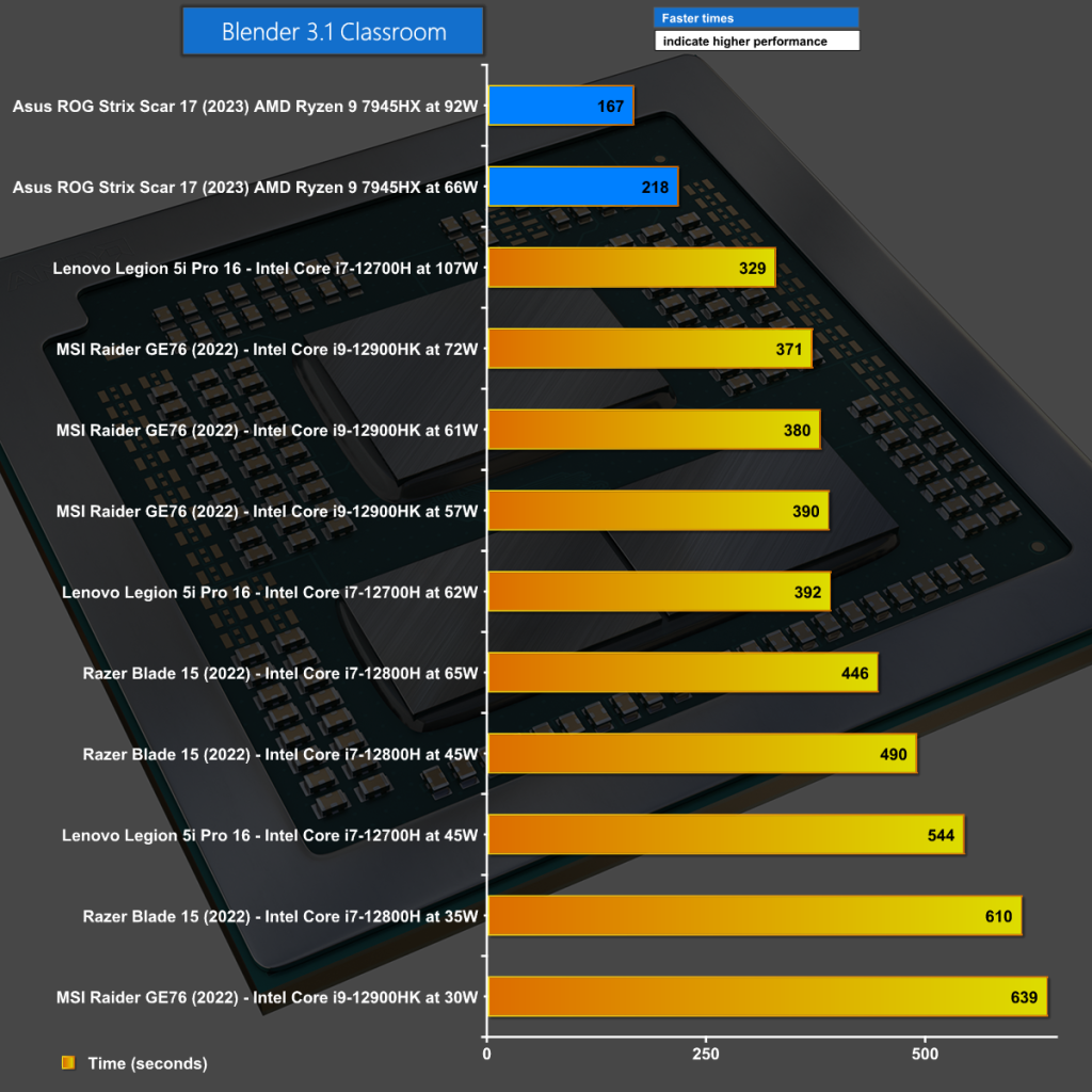 Blender 3 Classroom shows similar results to Cinebench R23 and the new Ryzen 9 again dominates the chart.