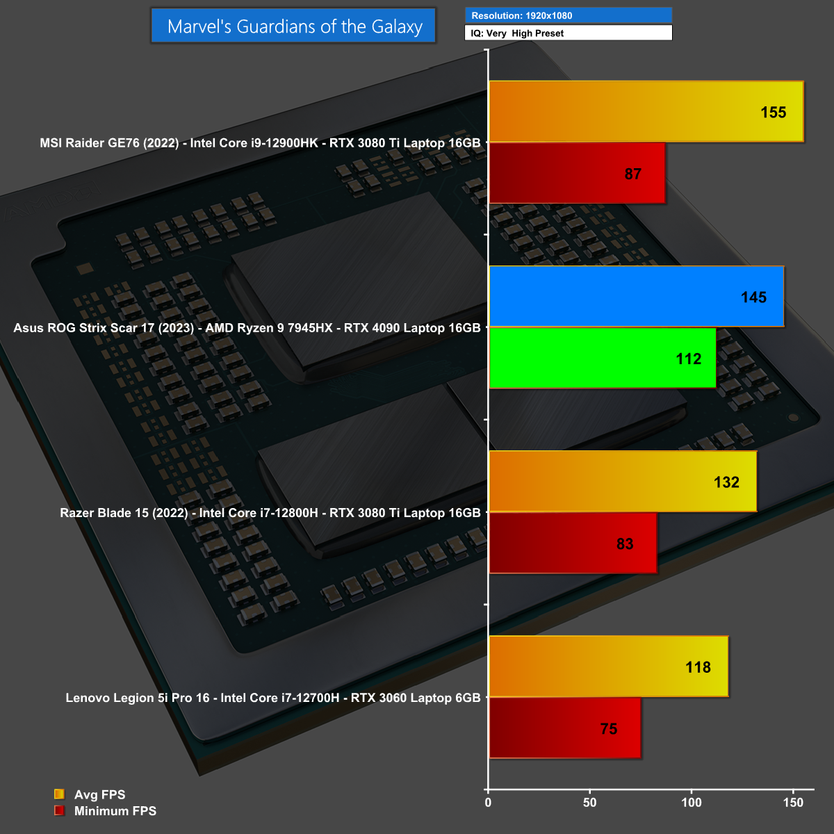 In Marvel Guardians of the Galaxy at 1080p the combination of Ryzen 9 and RTX 4090 Laptop performs well but fails to top the chart.