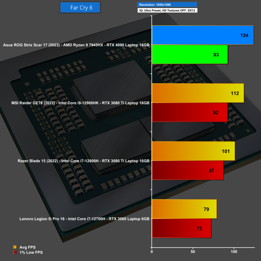 In Far Cry 6 at 1080p we see, as expected the Asus ROG Strix Scar 17 does a good job and the gaming experience is top notch.