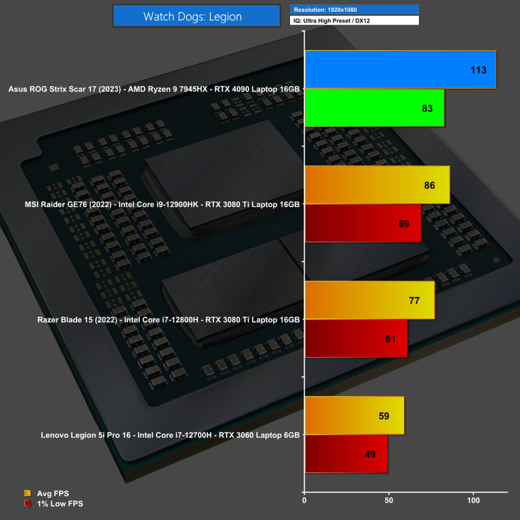 Watch Dogs Legion at 1080p puts the cherry on the icecream sundae with the ROG Strix Scar 17 stomping the rest of the field.