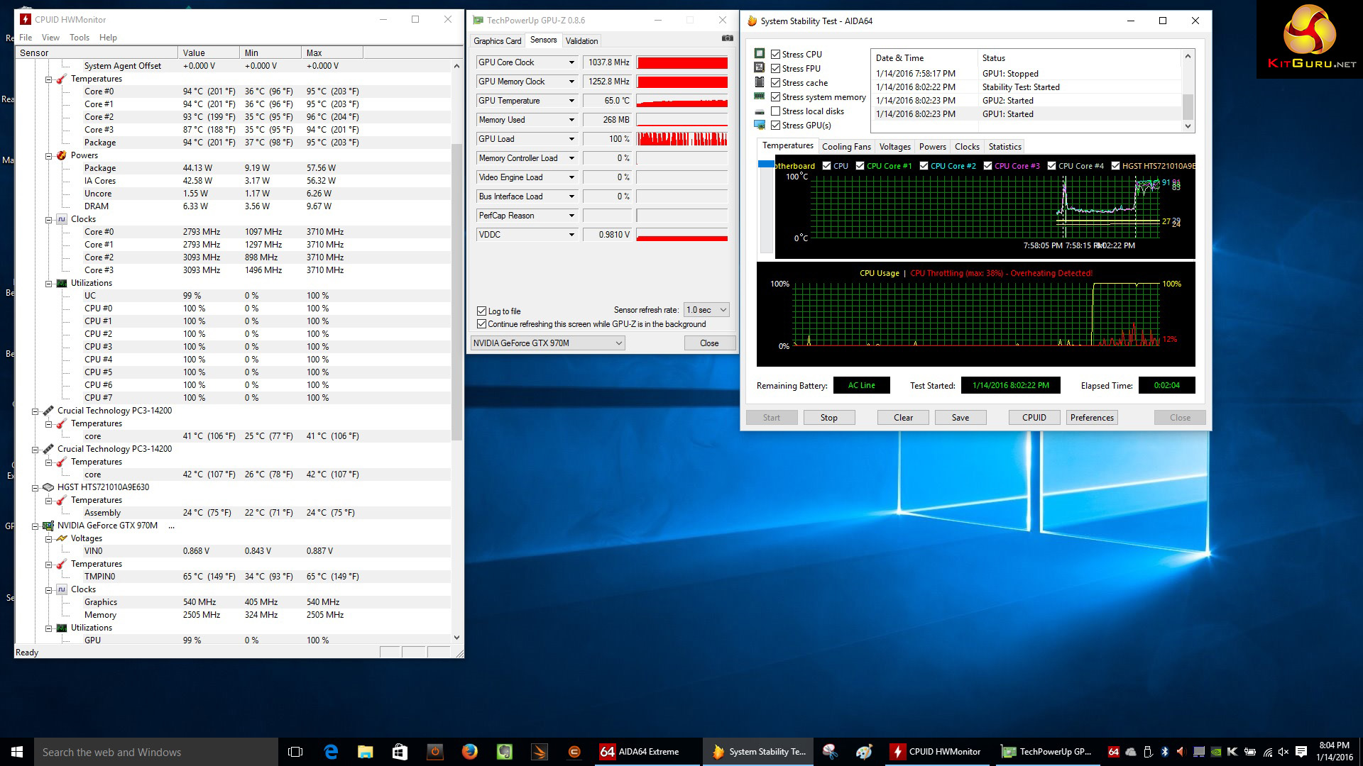 We used AIDA 64 to stress the CPU and GPU at 100 percent and the result you see in our screen grabs is that GPU temperatures rose to the mid-60s while CPU temp passed 90 degrees.