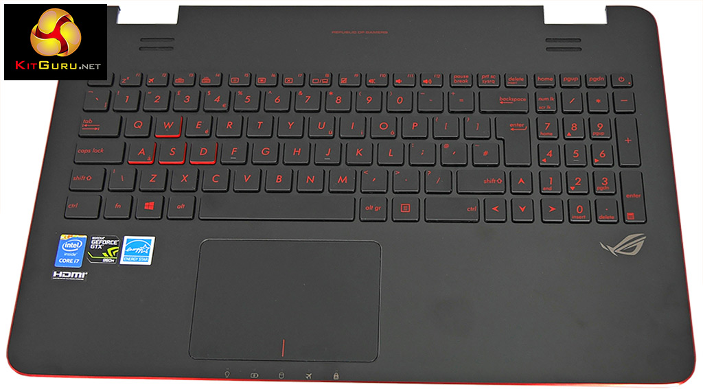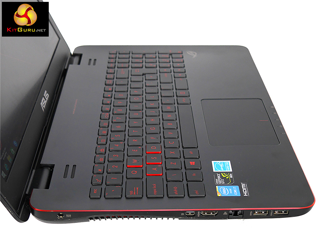 The Asus Republic Of Gamers G551J laptop delivers the styling cues we have come to expect so you get a black and red colour scheme with red accents on the WASD keys and red back lights for the keyboard. If you take a squint inside the cooling exhaust vent you'll find it is red inside there too.
