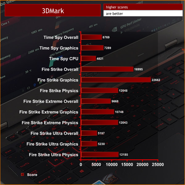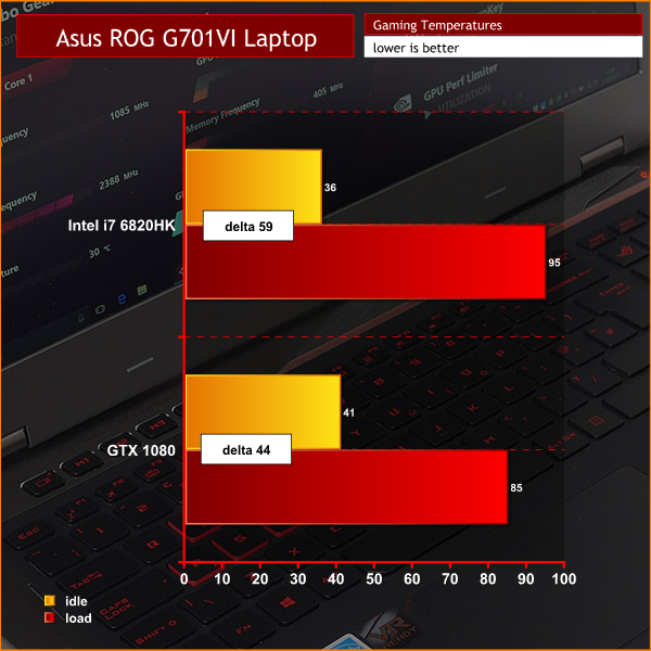 Watch our video and you will hear the Asus ROG G701VI in action. The cooling is fairly noisy even when the laptop is only working gently and it gets louder when the system is under load. It is clear that Asus has ramped up the fan curve to keep the temperatures in check and we found it all rather annoying and intrusive.