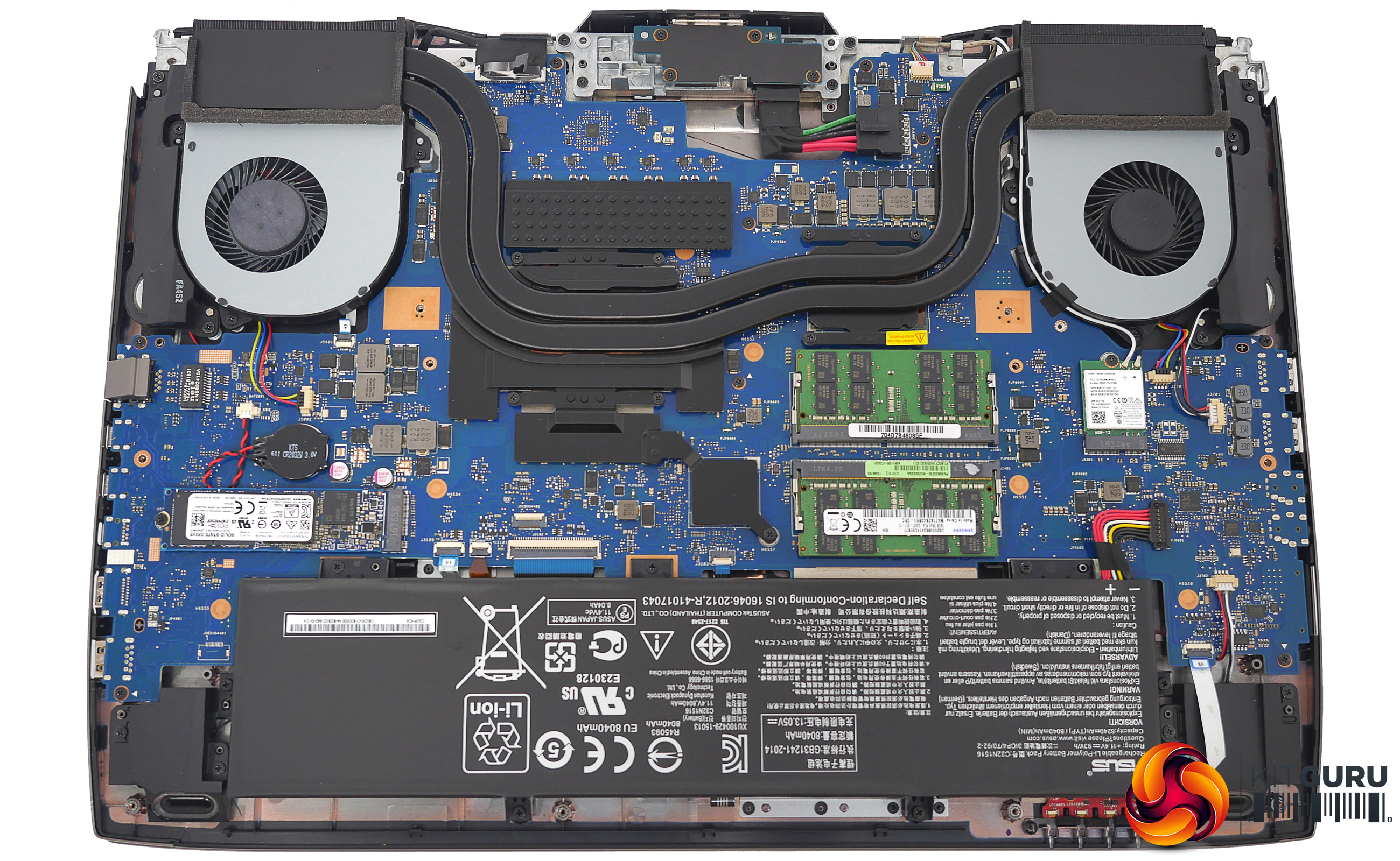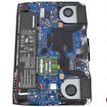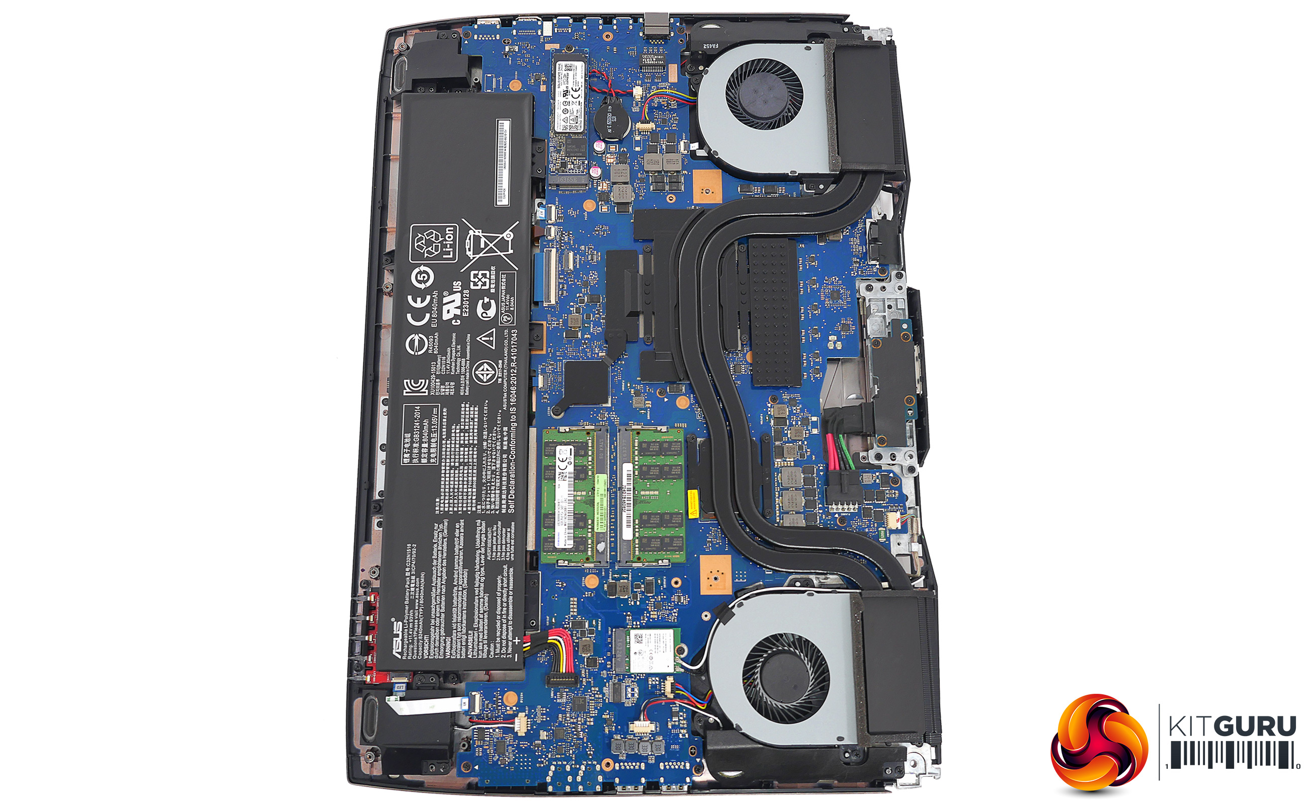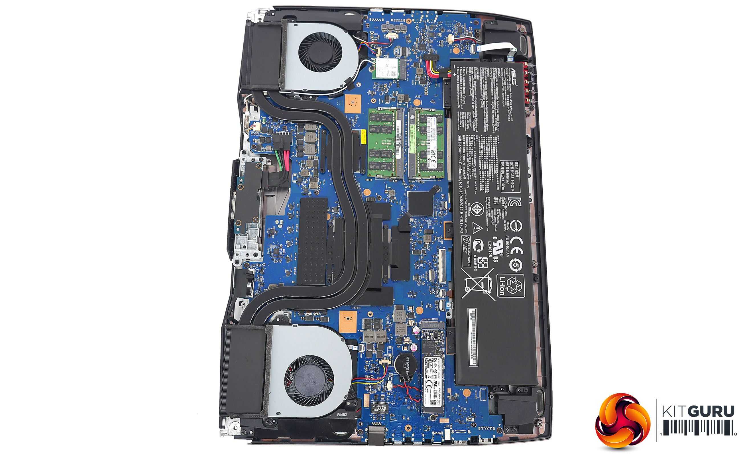Our photos inside the Asus ROG G701VI show a conventional cooling layout with the two coolers in the rear corners and a pair of wide, flat heatpipes that reach from one side to the other, crossing the CPU and GPU along the way. The curious thing is that the cool air is drawn in pretty much in the centre of the underside and then passes through the casing before it is exhausted to the rear. Generally the air is drawn in much closer to the heat exchangers and this layout seems as though it could be prone to getting blocked were you to rest the laptop on soft furnishings or pretty much any surface that isn’t hard and level, such as a table.
