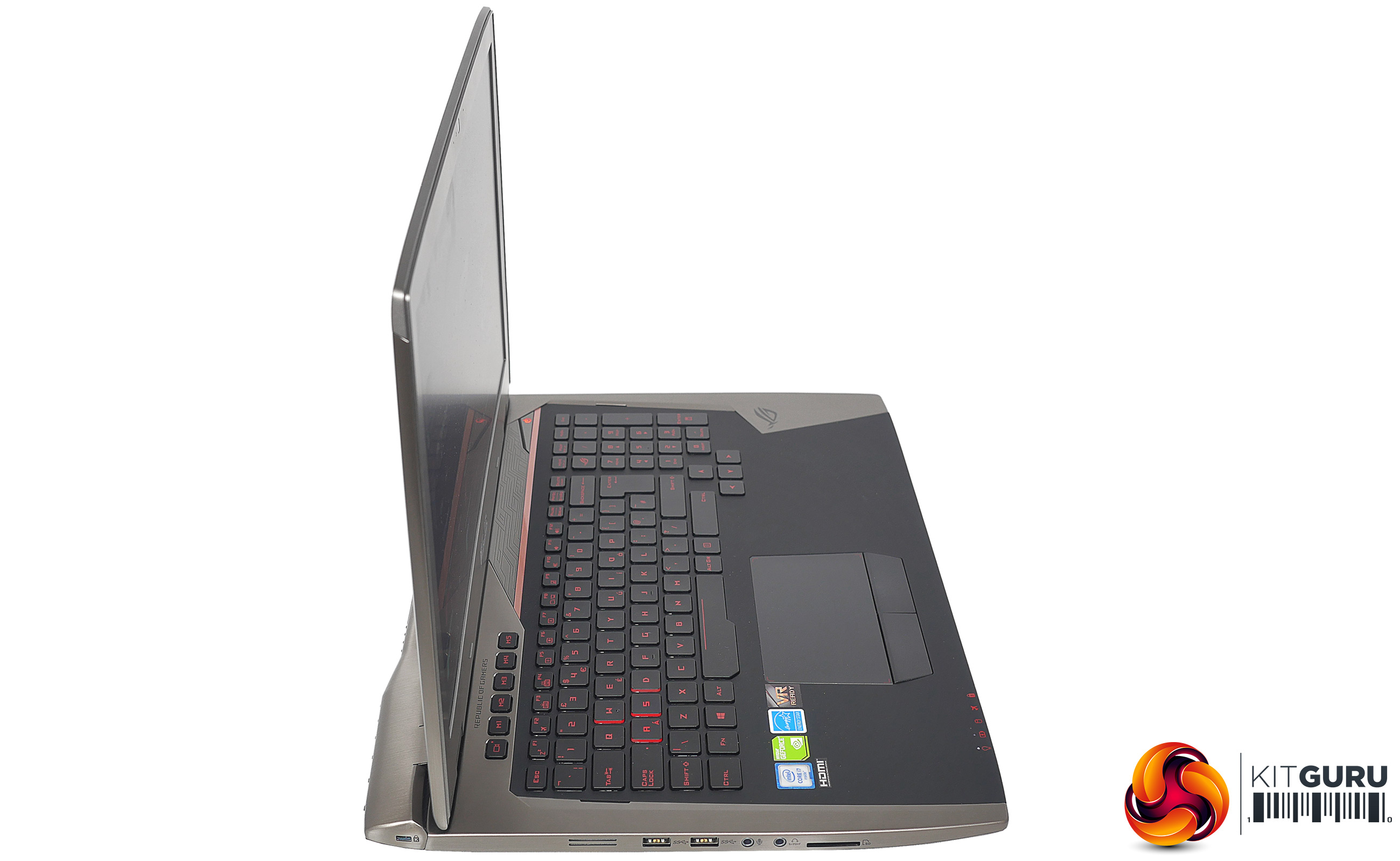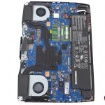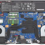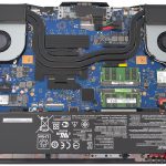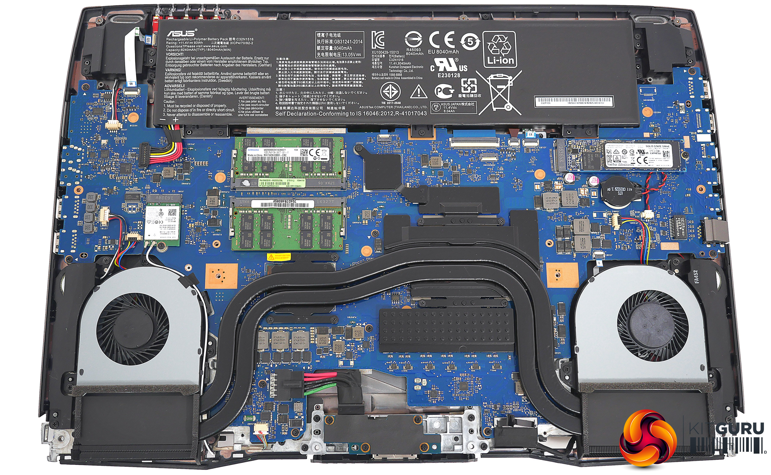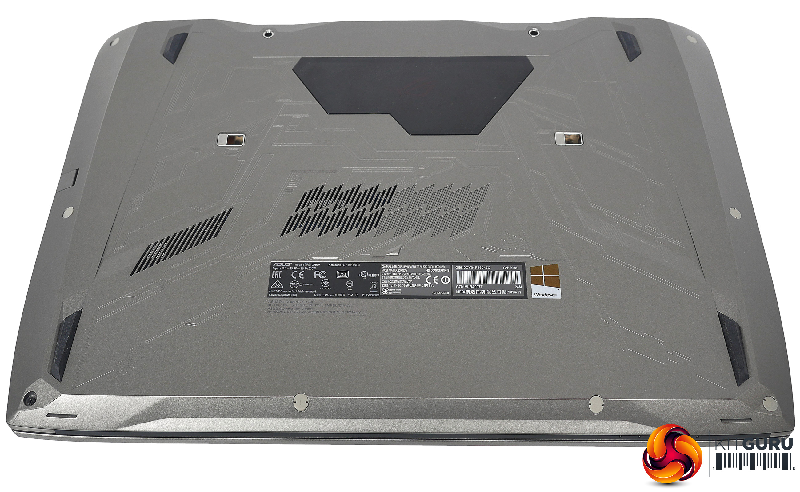 Our photos inside the Asus ROG G701VI show a conventional cooling layout with the two coolers in the rear corners and a pair of wide, flat heatpipes that reach from one side to the other, crossing the CPU and GPU along the way. The curious thing is that the cool air is drawn in pretty much in the centre of the underside and then passes through the casing before it is exhausted to the rear. Generally the air is drawn in much closer to the heat exchangers and this layout seems as though it could be prone to getting blocked were you to rest the laptop on soft furnishings or pretty much any surface that isn’t hard and level, such as a table.