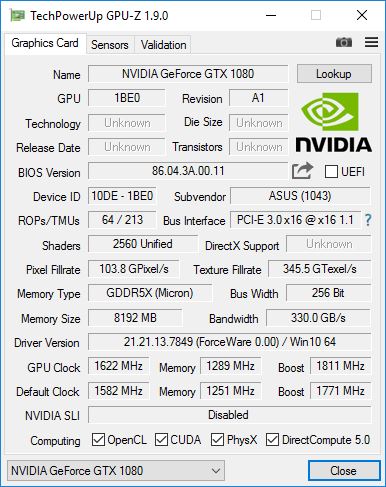 Graphics Nvidia GeForce GTX 1080 with 8GB VRAM